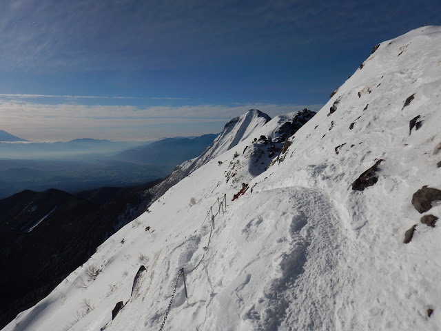4. □ Further Information: As I advanced forward from Mt. Io to Mt. Yokodake, conditions became worse. The path became narrow, steep, icy, etc. When the wind was strong, I had to stop and maintain balance so as not to slide down. Because of the lack of snow, I could seize chains that were already set up when I climbed steeper parts. But, in this season the chain is usually hidden under the snow so it can be very difficult to climb. I was lucky!
